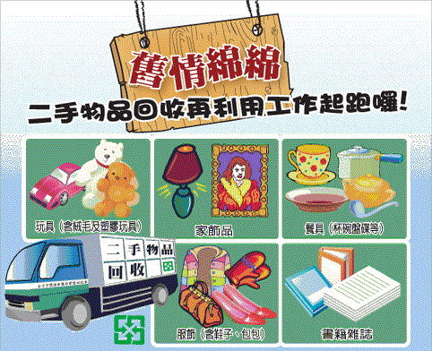 二、回收方式:請分類打物品回收專線,約定回收時間將由二手物品回收專車,車身懸掛「舊情綿綿二手物品回收專車」紅布條前往收取。(請勿將二手物品交給本局資源回收車收取)。
