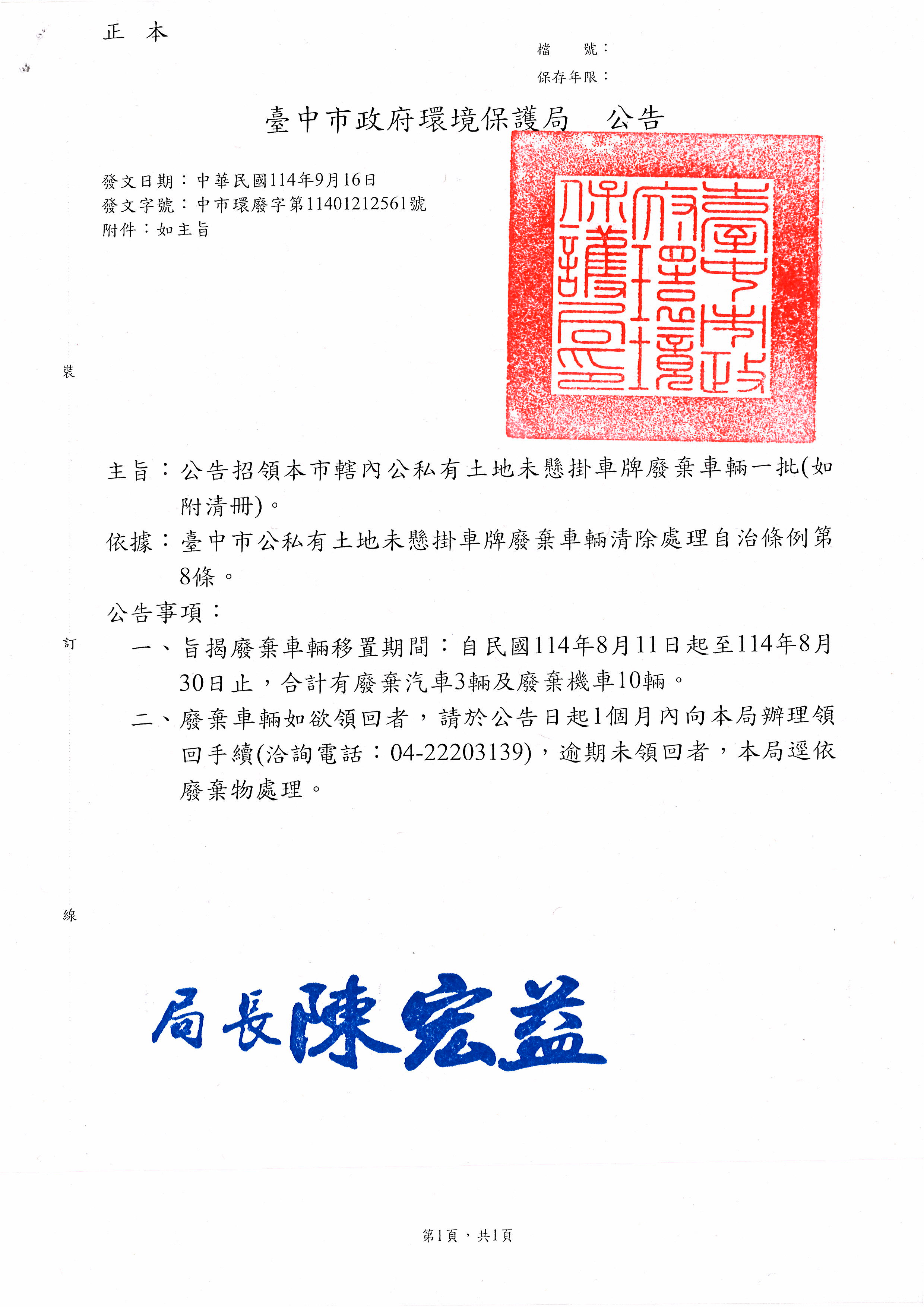 二、廢棄車輛如欲領回者,請於公告日起1個月內向本局辦理領回手續(洽詢電話:04-22203139),逾期未領回者,本局逕依廢棄物處理。