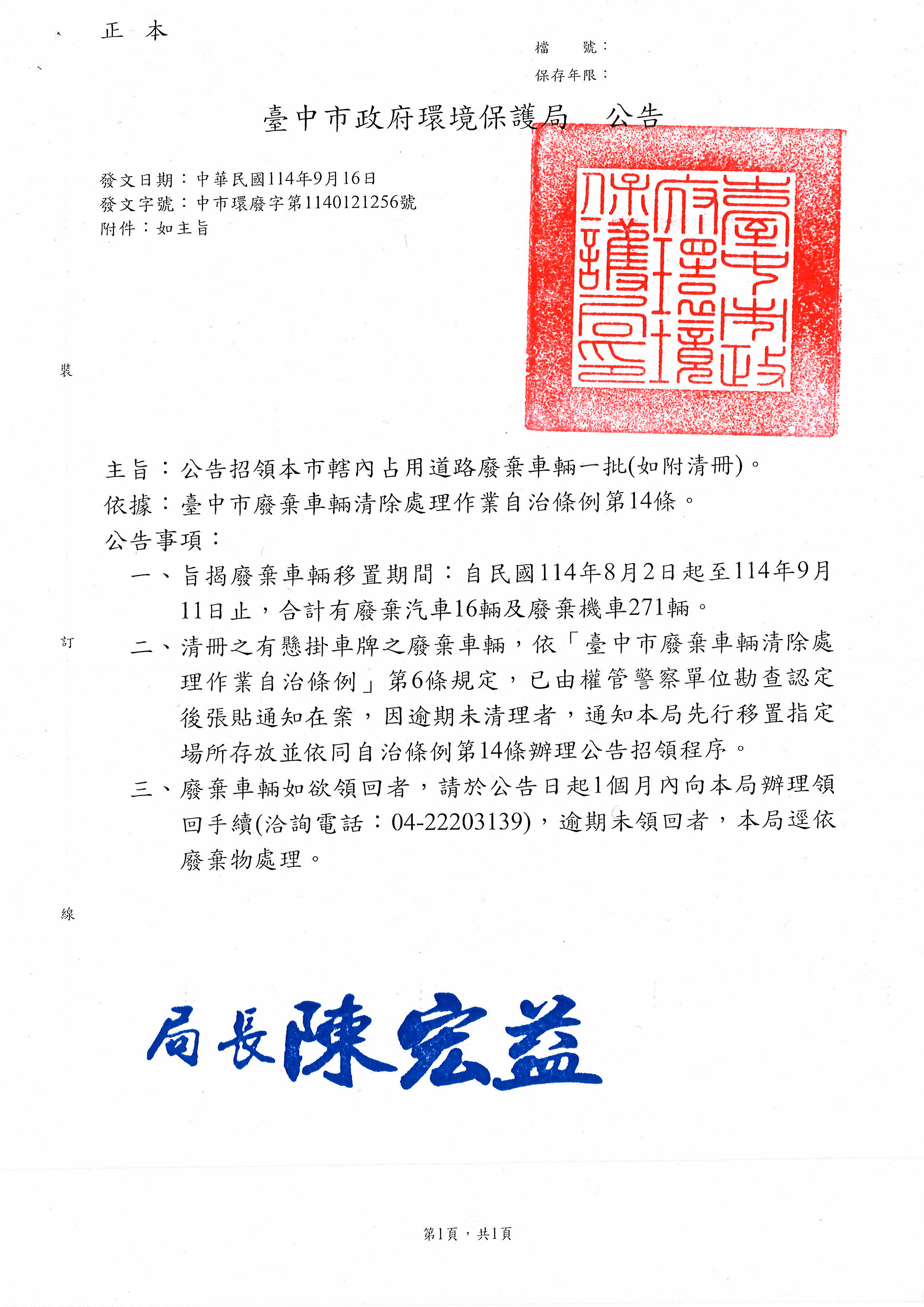 主旨:公告招領本市轄內占用道路廢棄車輛一批(如附清冊)。
