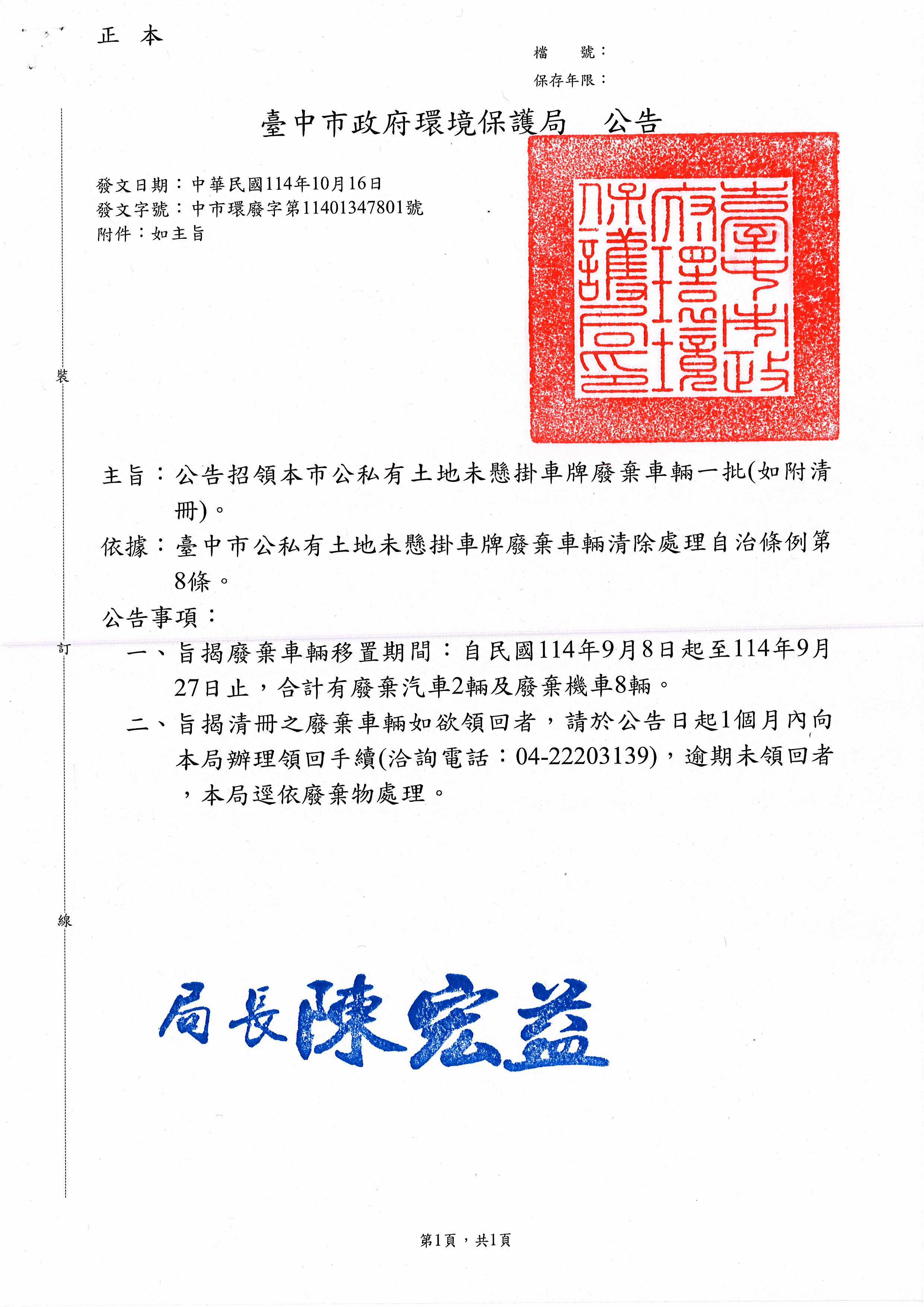 發文字號:中市環廢字第11401347801號
