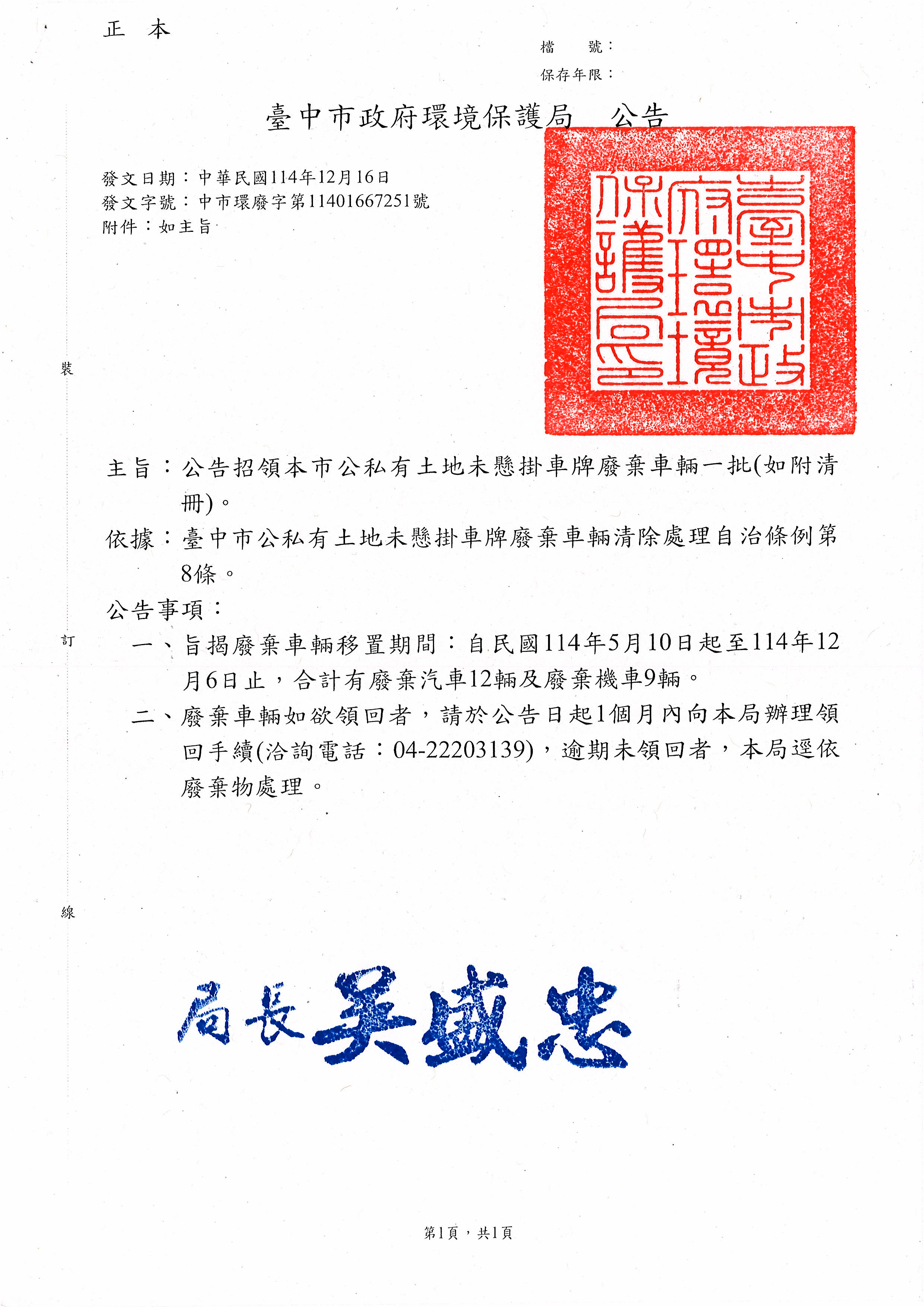 發文字號:中市環廢字第11401667251號