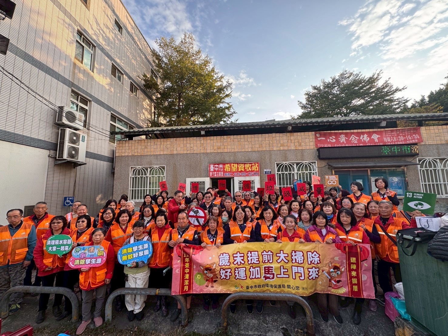 為迎接農曆新年,台中市政府環保署去年(18日))當天凌晨在潭子區甘蔗裡,號召環保工隊展開「台中清潔月」體能活動。現場集結約80位志願者與民眾捲袖子、回應環境清掃。環保署呼籲,民眾要落實「愛物惜、能修就修、資源循環」的精神,並鼓勵提早開始大掃除,將其「化整除」疫情暖通報,不僅能疏導垃圾清運負擔,更要落實各行各業從容不迎地起金馬年。