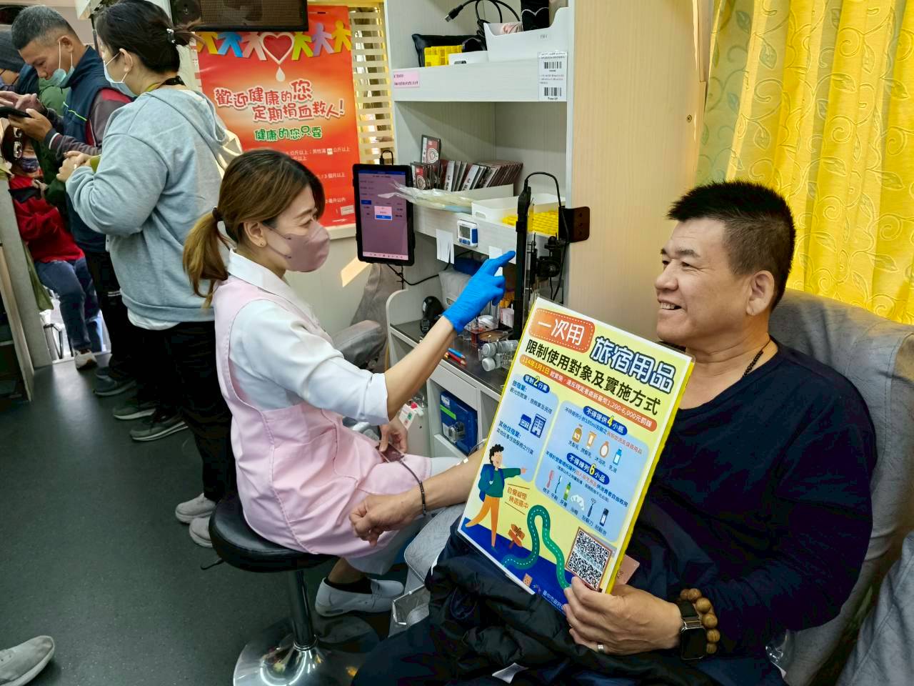 為減緩過年血荒、助人一命,台中市政府環保局與捐血中心合作辦理捐血活動,把捐血車開到清潔隊,由第一線清潔同仁們捐獻熱血,日前由清淨園區及中西東南區隊打頭陣,今(4)日由清水區隊、豐原區隊接力,號召清潔同仁及鄰近居民響應,熱血一袋、無可取代,分區4場次超過500人參與,清潔隊員熱血加碼、愛心不落人後,做好體內環保,捐血做愛心、利己又利人。