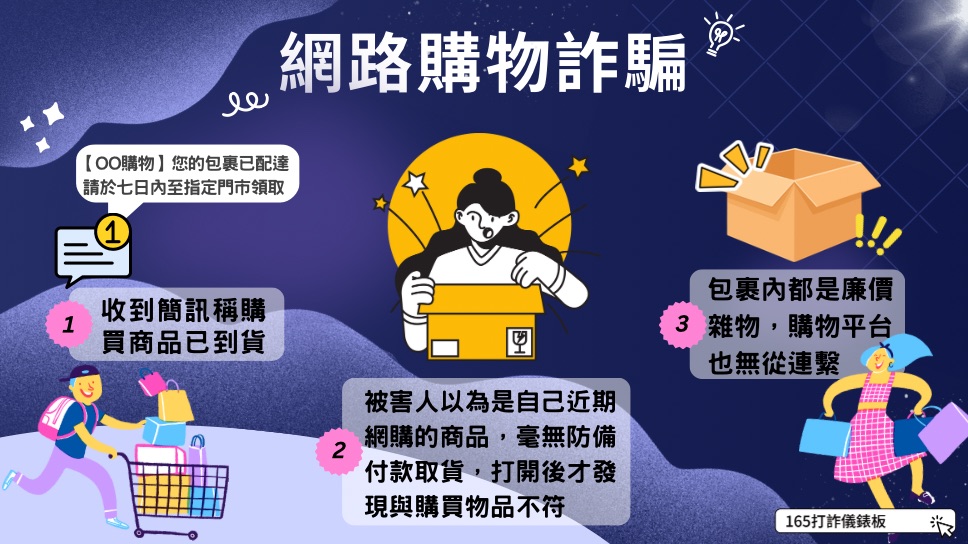 網路購物詐騙 網路購物詐騙1.收到簡訊稱購物買商品已到貨2.被害人以為是自己近期網購的商品,毫無防備付款取貨,打開後才發現與購買物品不符3.包裹內都是廉價雜物,購物平台也無從連繫 《資料來源:內政部警政署》