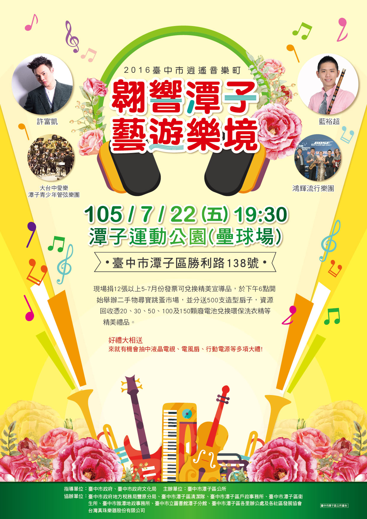 二、活動精彩節目內容有:在地大台中愛樂潭子青少年管弦樂團帶來精采的曲目,還有鴻輝流行樂團帶來搖滾的動感歌曲,另外還有入圍今年金曲獎的許富凱,將帶來打動人心的成名歌曲。