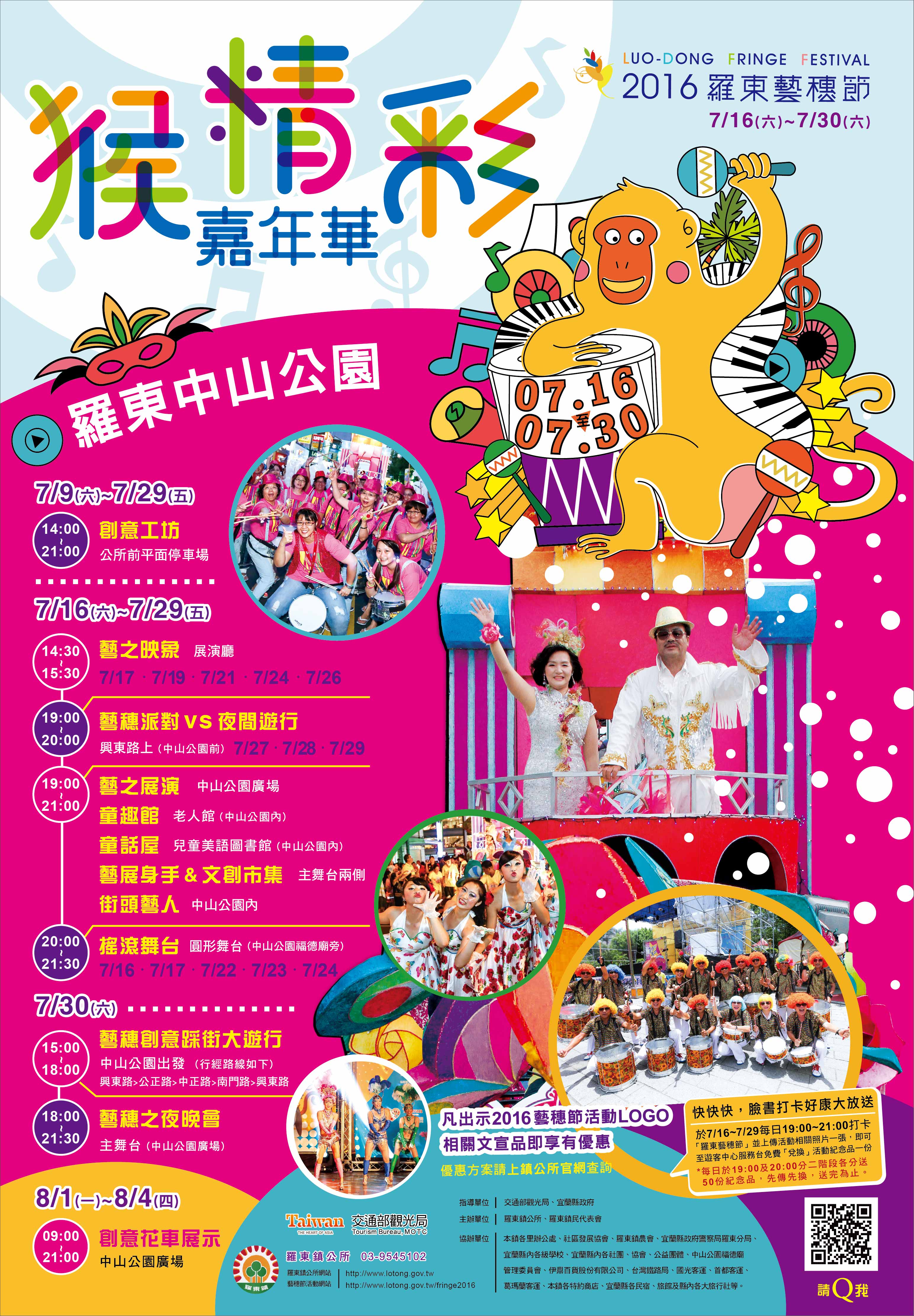 宜蘭縣羅東鎮公所「2016羅東藝穗節」活動,本活動期間自今(105)年7月16日(六)至7月30日(六),活動地點於本鎮中山公園及公所周邊,歡迎蒞臨指導。 聯絡人:劉俐含 聯絡電話:03-9545102分機381