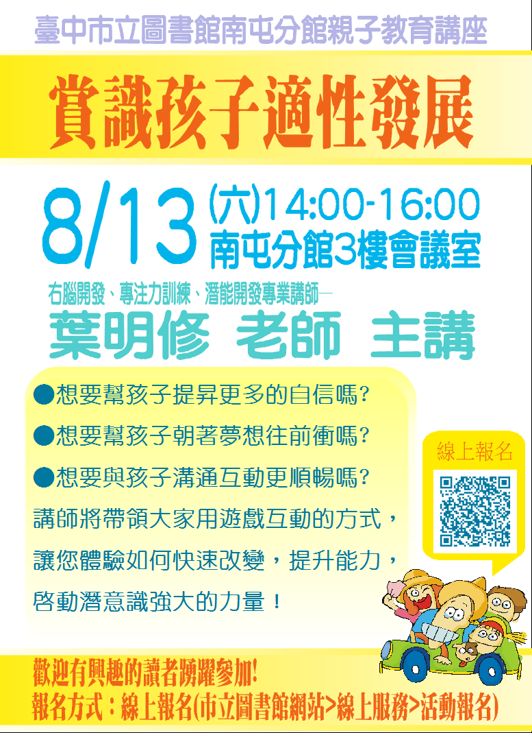 臺中市立圖書館訂於本(105)年8月13日(六)於本館南屯分館舉辦「賞識孩子適性發展」親子教育講座,本館南屯分館訂於本(105)年8月13日(六)舉辦「賞識孩子適性發展」親子教育講座,邀請具備右腦開發、專注力訓練、潛能開發專才的葉明修老師,以遊戲互動的方式帶領大家瞭解孩子的人格特質,增近親子溝通,並體驗如何快速改變、提升能力,啟動潛意識強大的力量。時間:105年8月13日(六)下午2時至4時。地點:臺中市立圖書館南屯分館3樓會議室(臺中市南屯區大墩十二街361號)。 聯絡人:林品慧 聯絡電話:04-22533836