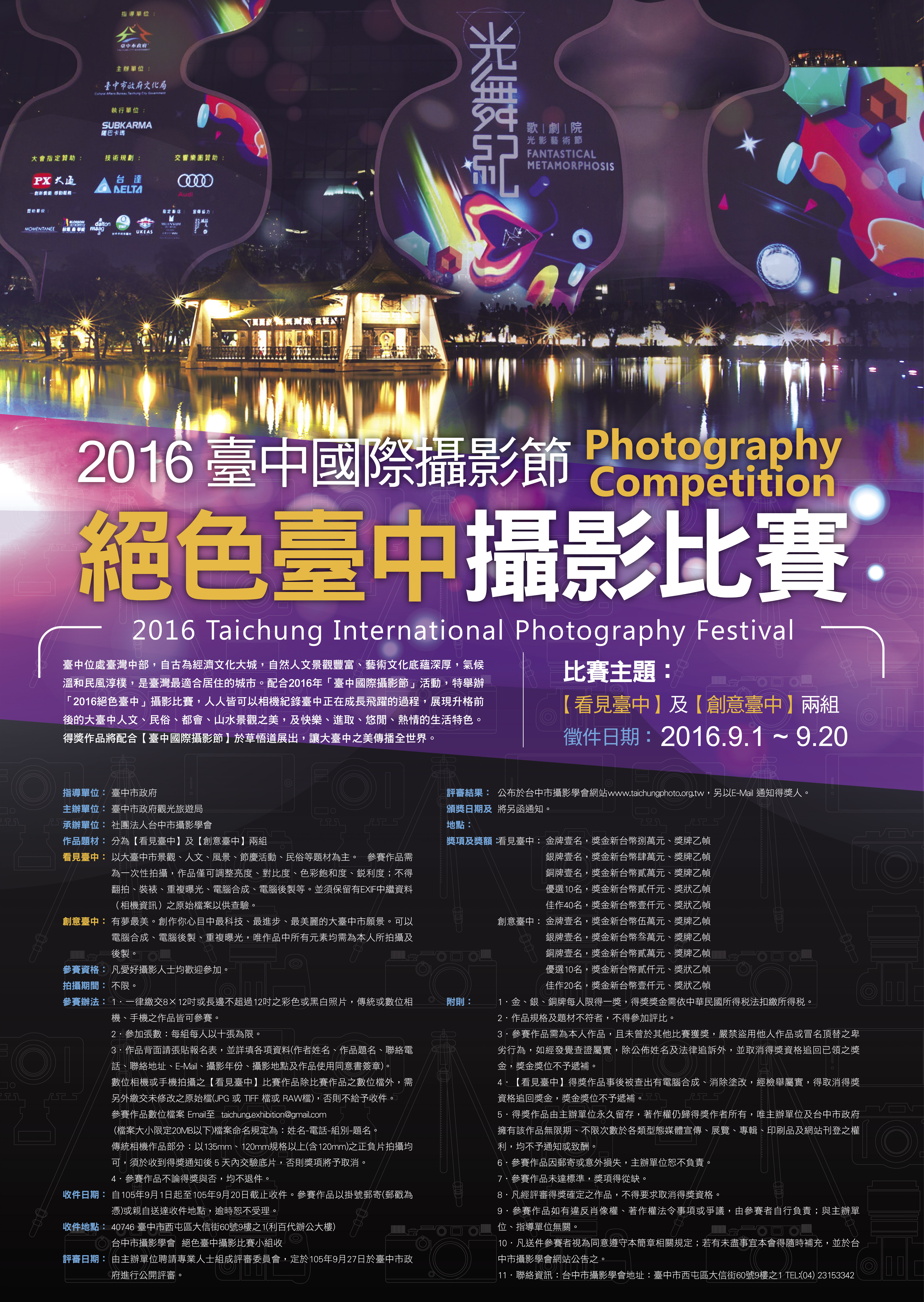 國際攝影學會將於10月底至台中舉辦「台中國際攝影節」,台中市政府觀光旅遊局也配合舉辦「2016絕色台中攝影比賽」,徵求呈現大台中人文、風景、地景及建築的美麗照片,總獎金高達34萬元,得獎照片將在國際攝影節展出,9月1日起開始收件,歡迎各地攝影好手捕捉台中美麗風光,踴躍參加徵件。市府觀光旅遊局長陳盛山表示,「台中國際攝影節」將於10月27至31日在台灣大道市政大樓及草悟道舉辦,安排國際攝影年會、國際名家攝影展等,市府也徵求能呈現台中之美的好照片在國際攝影節展出,藉攝影鏡頭行銷台中。 聯絡人:陳家儒 聯絡電話:04-22289111轉58330