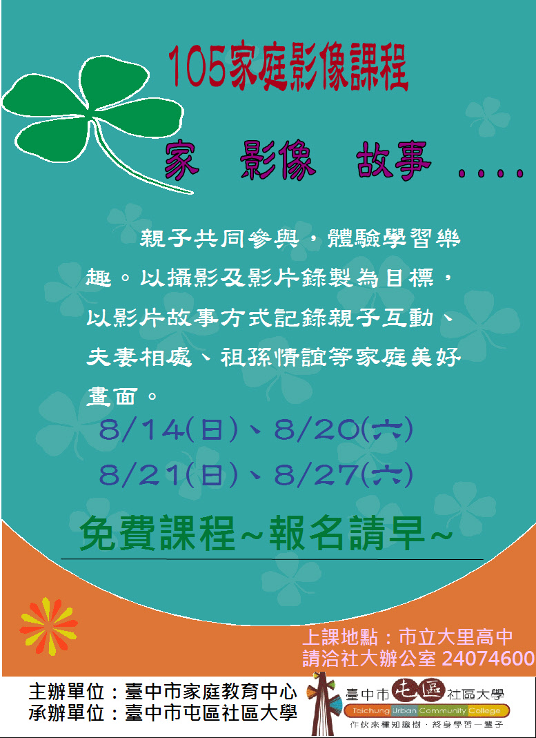 一、課程時間:8月14日(日)、8月20日(六)、8月21日(日) 、8月27日(六)。二、上課地點:臺中市屯區社區大學(臺中市立大里高中內)三、請惠予協助播放跑馬燈內容:「您是否有許多點點滴滴的回憶,不知如何記錄?臺中市家庭教育中心8/14、8/20、8/21、8/27在屯區社區大學辦理「家庭影像故事」攝影與影片剪輯課程,教您如何拍攝及製作感人、溫馨的影片,讓您成為影片製作達人!課程免費,歡迎報名~報名專線:24074600」 聯絡人:范豈瑗 聯絡電話:(04)22124885 #204