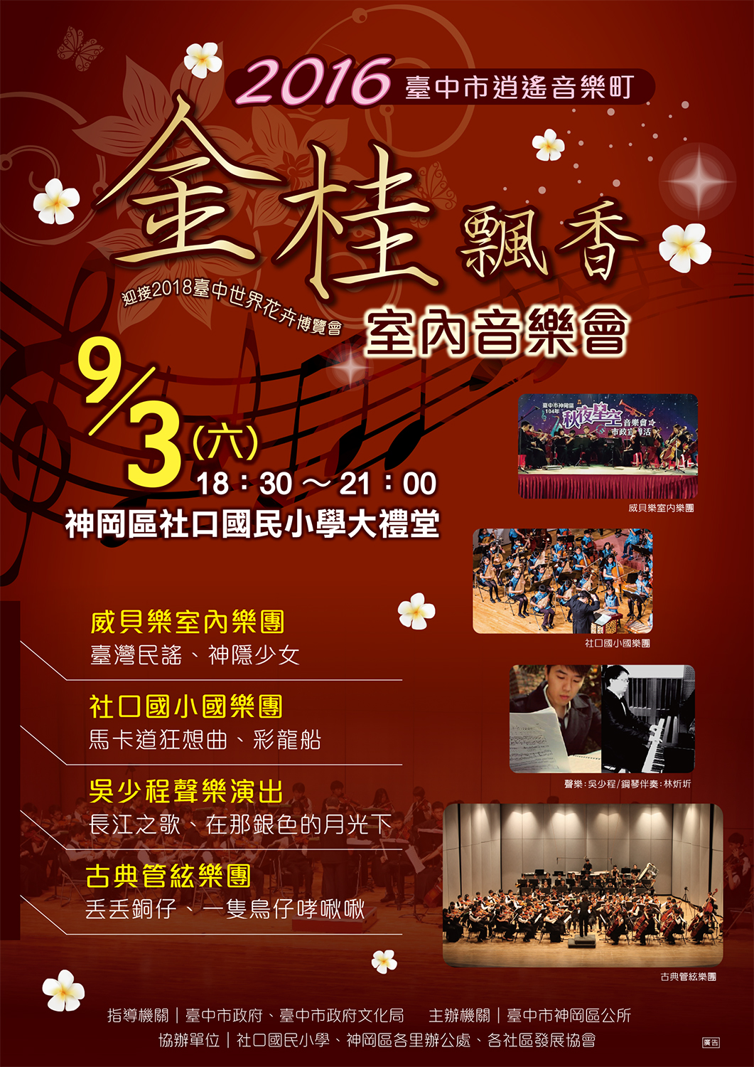二、為擴大宣傳,敬請協助於貴單位網站暨跑馬燈宣傳,本案之宣傳文案為:「2016臺中市逍遙音樂町─神岡金桂飄香室內音樂會,9月3日下午6時30分起假神岡區社口國小大禮堂舉辦,邀請本市傑出演藝團隊『古典管弦樂團』,以及『社口國小國樂團』、『威貝樂室內樂團』等中西樂團,還有神岡區新銳之星『吳少程』演出精采音樂及歌曲,邀請您聆賞今秋最高水準的音樂盛宴!」