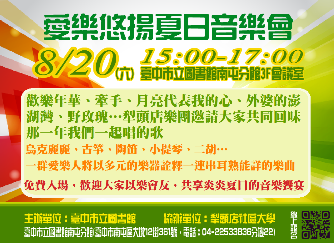 【轉發訊息】南屯分館訂於8月20日(六)舉辦「愛樂悠揚夏日音樂會」活動,邀請犁頭店樂團以各種中西樂器演奏及詮釋多首經典樂曲,提升民眾藝文欣賞及走入圖書館閱讀之興趣。