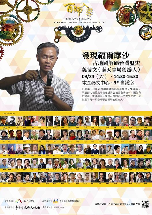 一、依據臺中市政府文化局105年8月24日中市文屯字第1050019276號函辦理。二、旨揭講座邀請南天書局創辦人魏德文分享「發現福爾摩沙─古地圖解碼臺灣歷史」,歡迎聆賞講座!三、本活動辦理時間為105年9月24日(六)14:30-16:30;地點為屯區藝文中心3樓大會議室(臺中市太平區大興路201號),採排隊入場,座位198席,額滿為止。四、此活動公務人員全程參與者,登錄終身學習時數2小時。五、附上屯區藝文中心地圖、講座DM。 聯絡人:葉小姐 聯絡電話:04-23921122#112