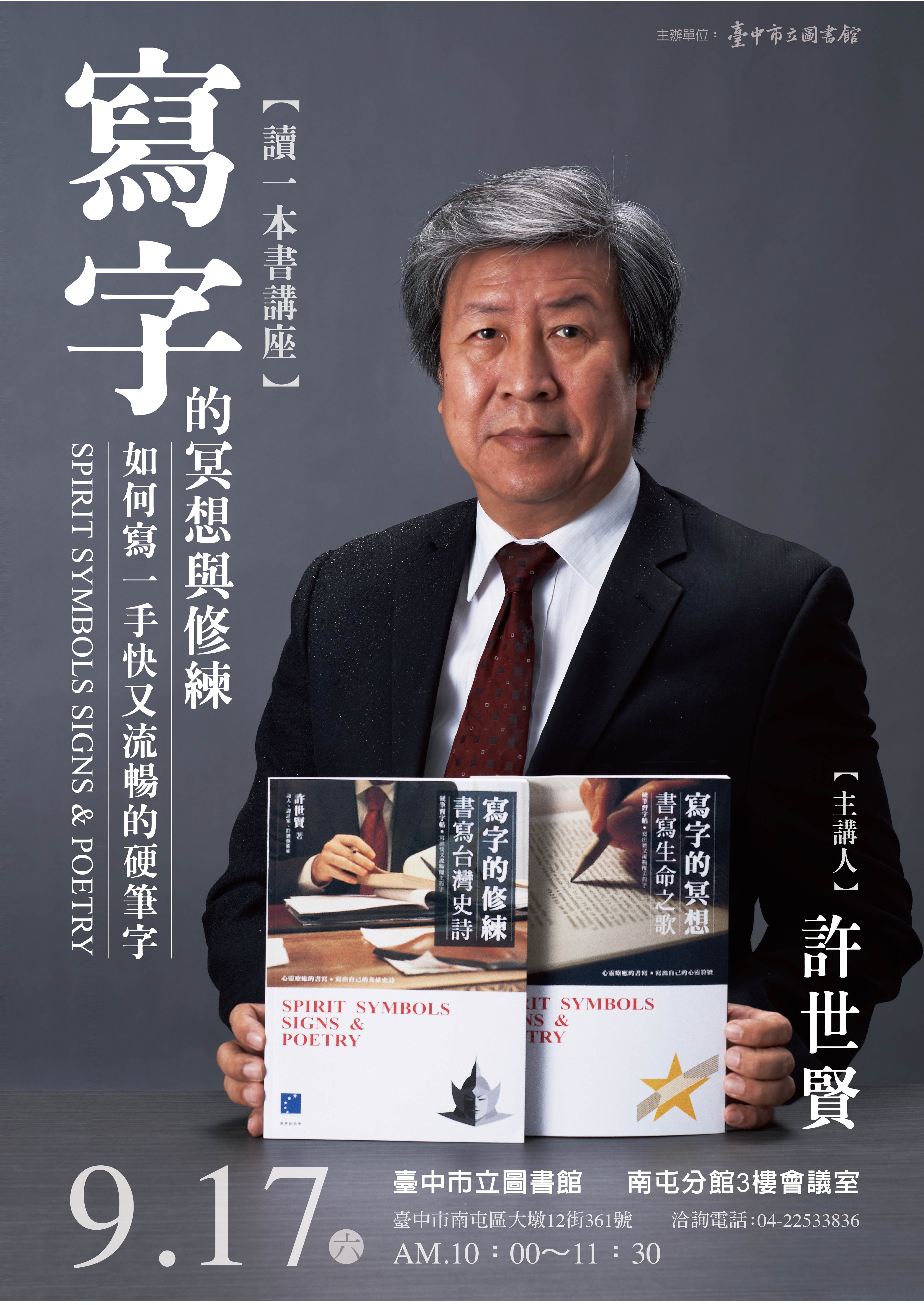 一、105年9月17日(六)舉辦,將邀請符號藝術家許世賢分享「寫字的冥想與修練-如何寫一手快又流暢的硬筆字」。老師將以互動的方式,帶領大家臨摹書寫詩集,藉此習得正確的寫字方法,並領略詩歌美妙之處。
