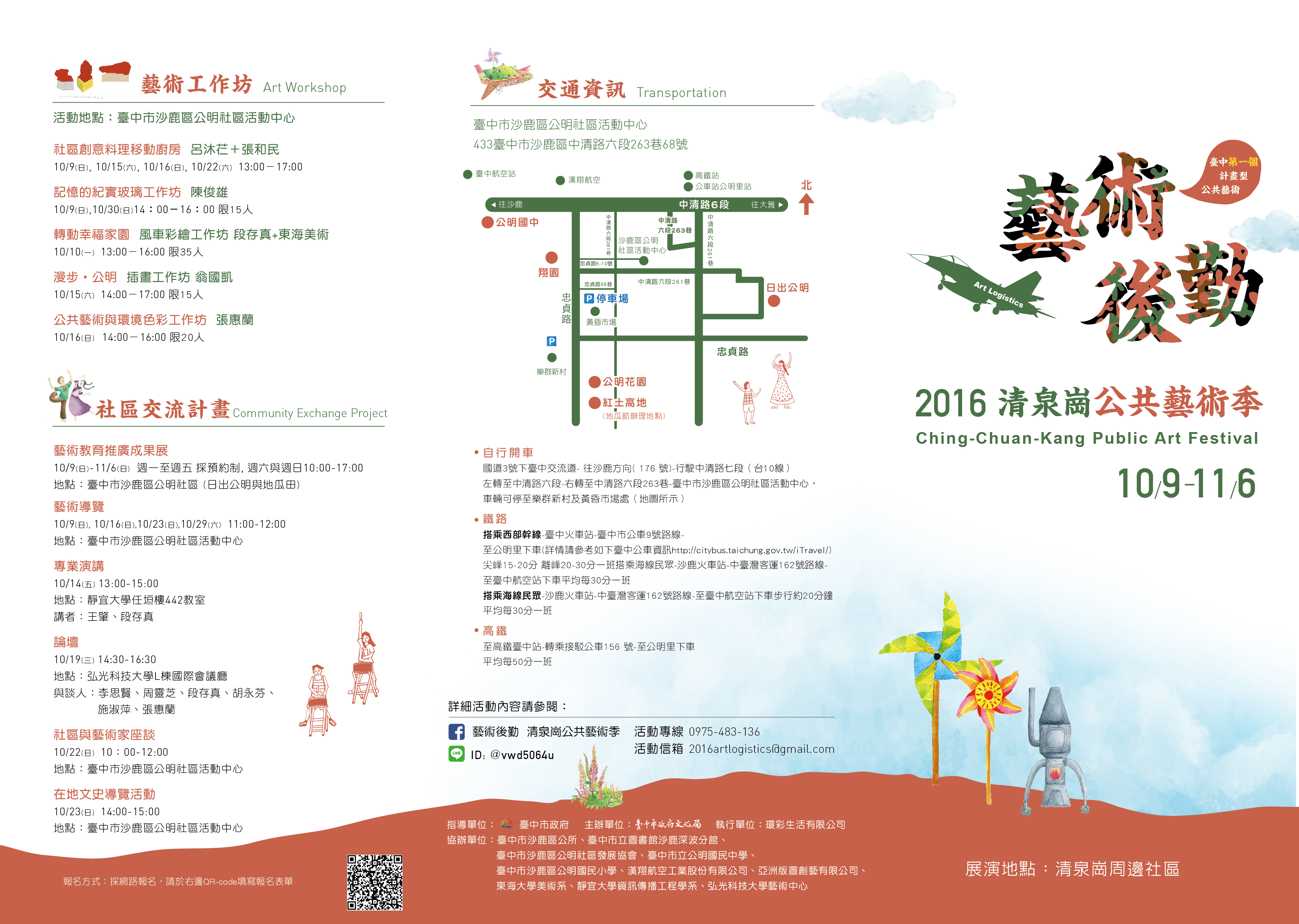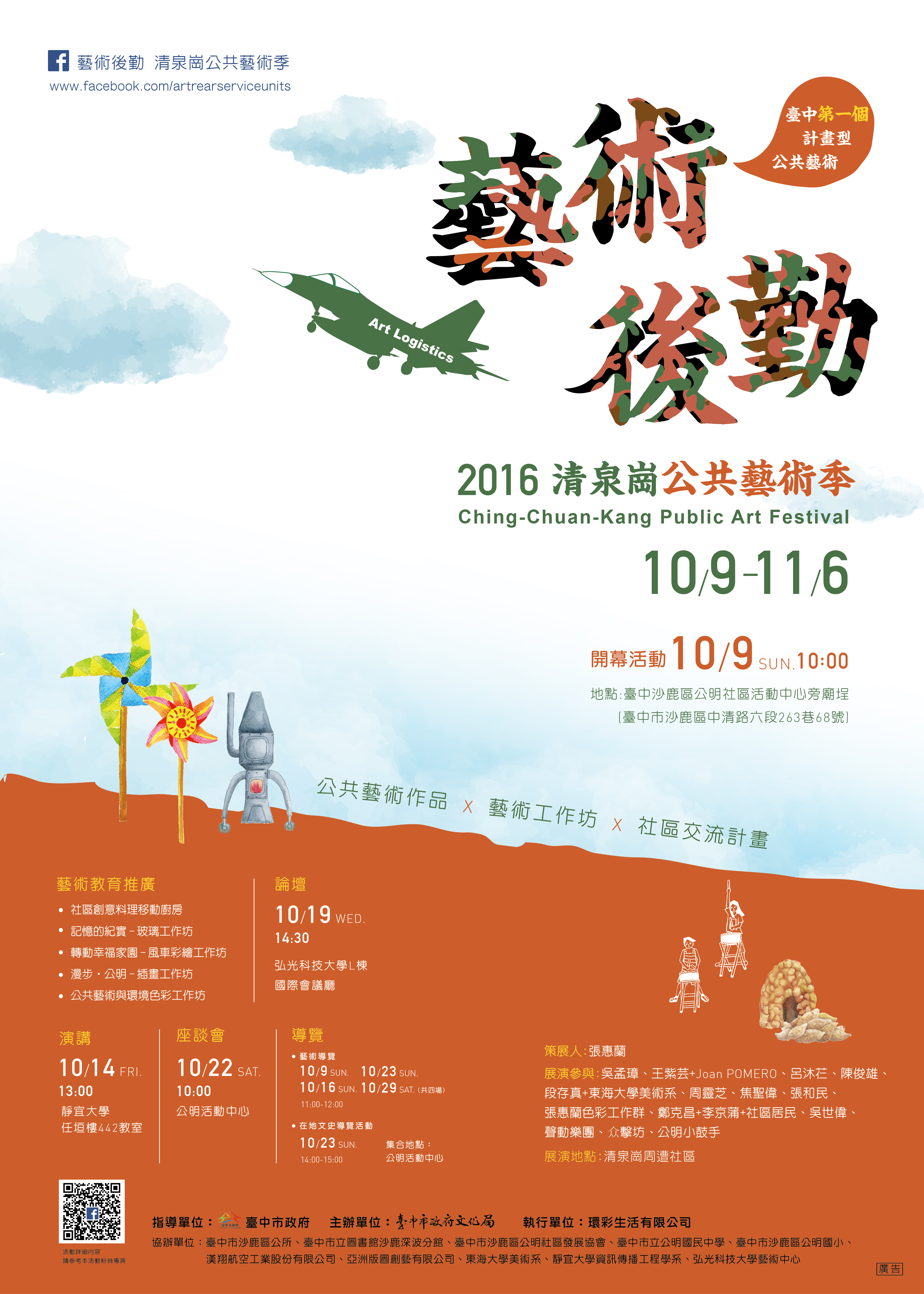 一、依據臺中市政府文化局105年10月4日中市文視字第1050022599號函辦理。二、旨揭活動為臺中市首件計畫型公共藝術,將在清泉崗周邊社區盛大辦理,內容涵蓋空間裝置作品展、大型公共藝術集體創作、社區藝術工作坊成果展、論壇、演講、座談會及藝術導覽,敬邀民眾一起體驗和探索藝術,惠請協助於網站宣傳,並張貼文宣,文宣將於日後寄達。三、檢附活動總表及海報電子檔各乙份。 聯絡人:彭先生 聯絡電話:04-22289111#25214