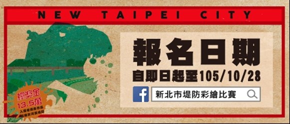 一、活動徵件時間:即日起至105年10月28日止。二、活動地點:新北市華中橋下恐龍園區。三、宣傳時間:即日起至105年12月31日止。四、檢送活動banner電子檔1份,惠請貴所協助將活動banner置於官網並建立連結至活動網站(網址:http://www.ntpcriverwall.com.tw/) 聯絡人:辦事員孫怡修 聯絡電話:02-8969-9596 分機206