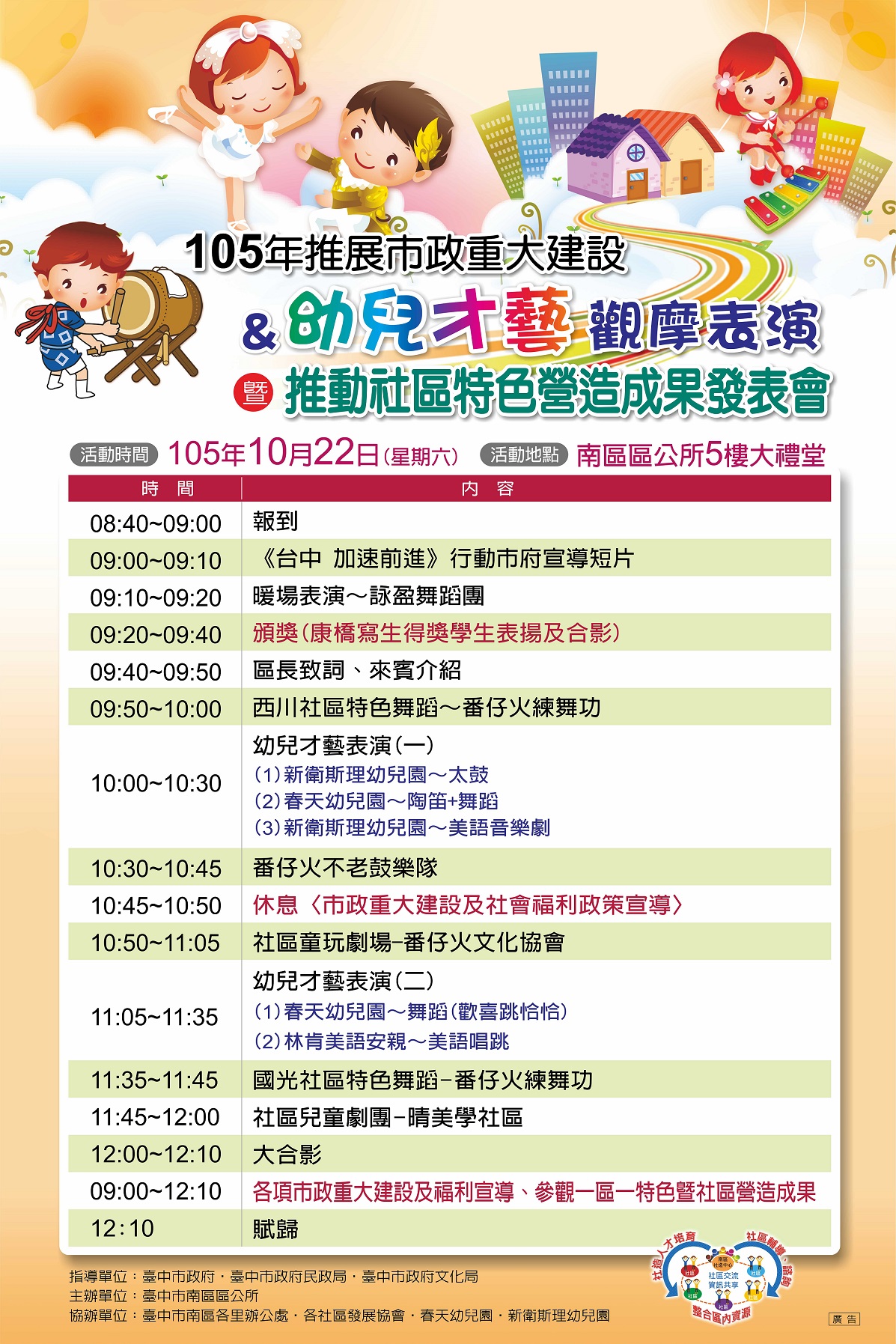 一、謹訂於105年10月22日(星期六)上午8時40分於本所5樓大禮堂。二、本活動為推展市政重大建設結合幼兒才藝觀摩表演並與本(105)年執行一區一特色及各社造點推動社區營造等工作共同辦理聯合成果展,使市政宣導及社區營造活動兼具動態與靜態感,吸引民眾全家大小共同參與。三、檢附活動海報電子檔1份。 聯絡人:徐子欣 聯絡電話:04-22626105#315