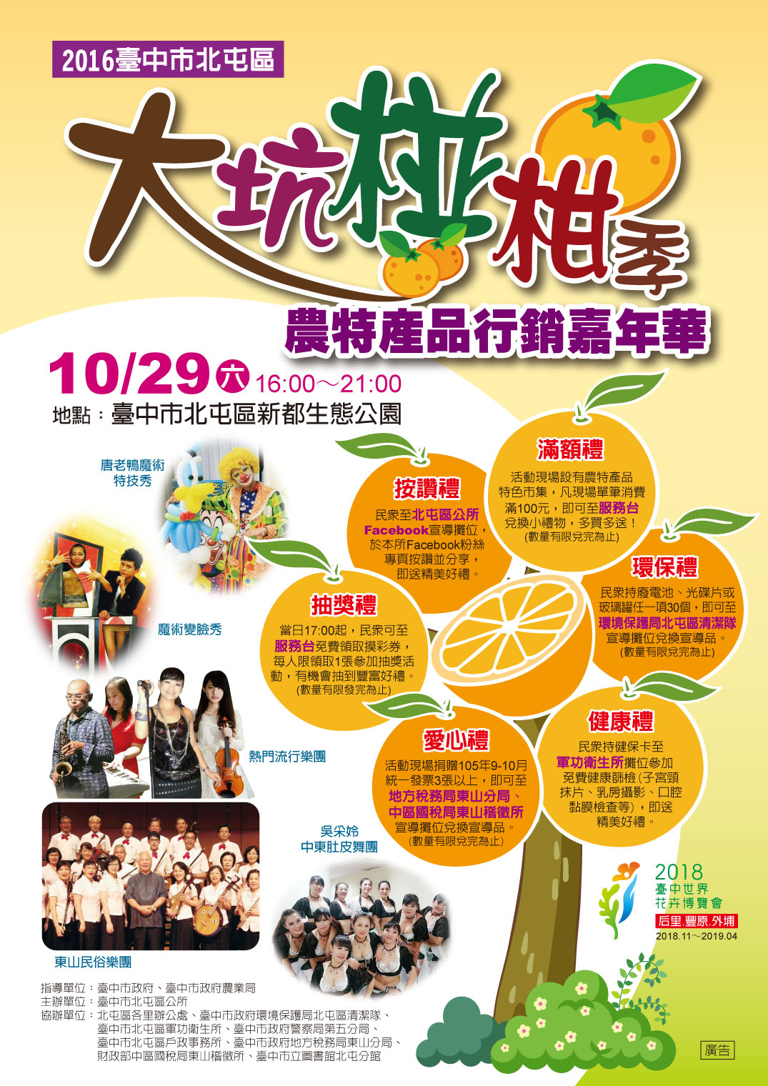 有關本所辦理「2016臺中市北屯區大坑椪柑季農特產品行銷嘉年華」1案,敬請踴躍參加!
