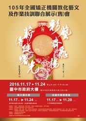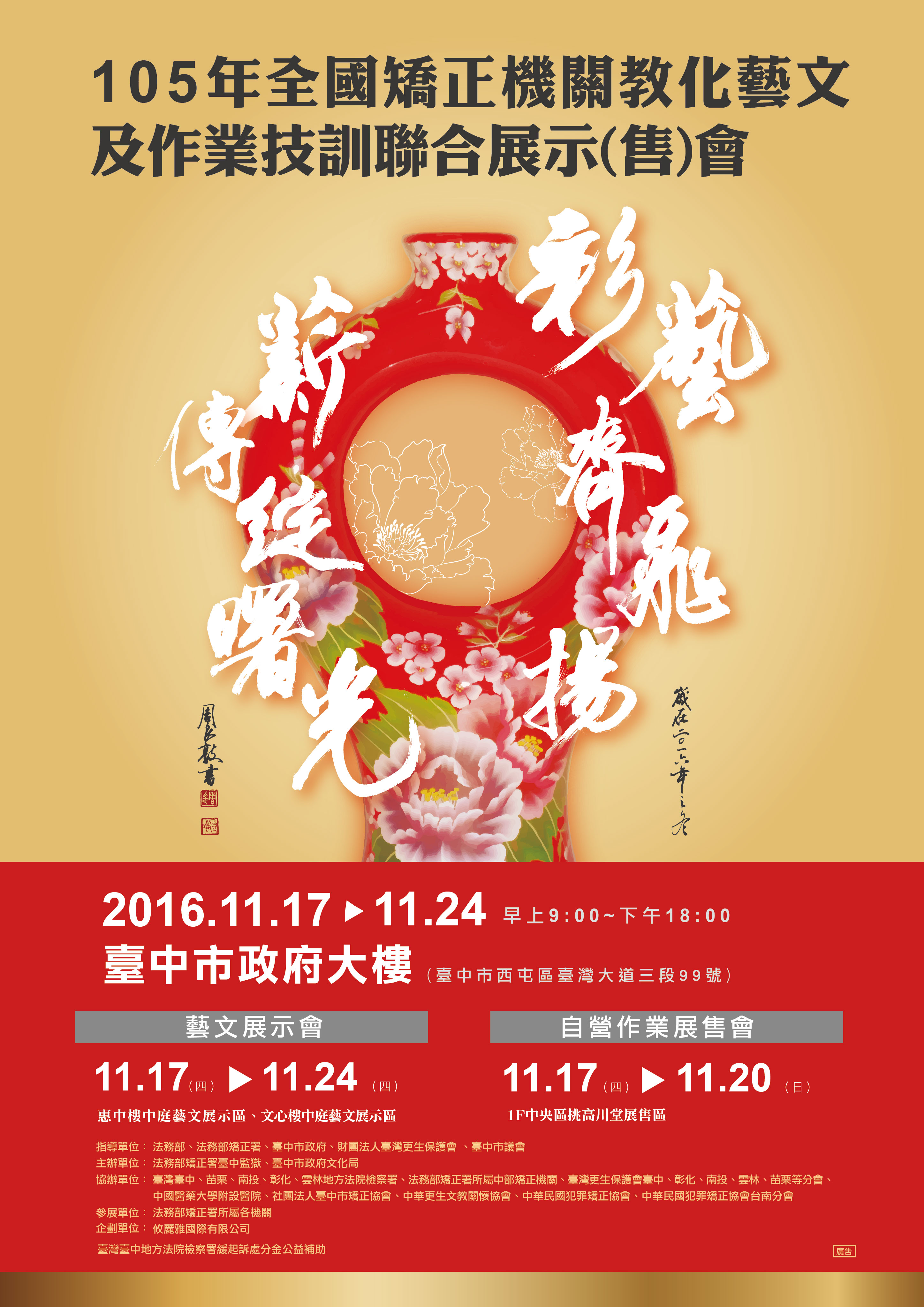 二、由本局及法務部矯正署臺中監獄主辦之「105年全國矯正機關教化藝文及作業技訓聯合展示會」活動,即日起至11月24日(四)在臺灣大道市政大樓文心樓、惠中樓1樓中庭辦理。會中展出收容人及指導老師書畫、木雕、石雕、陶藝、漆器等作品,歡迎到現場參觀、欣賞。