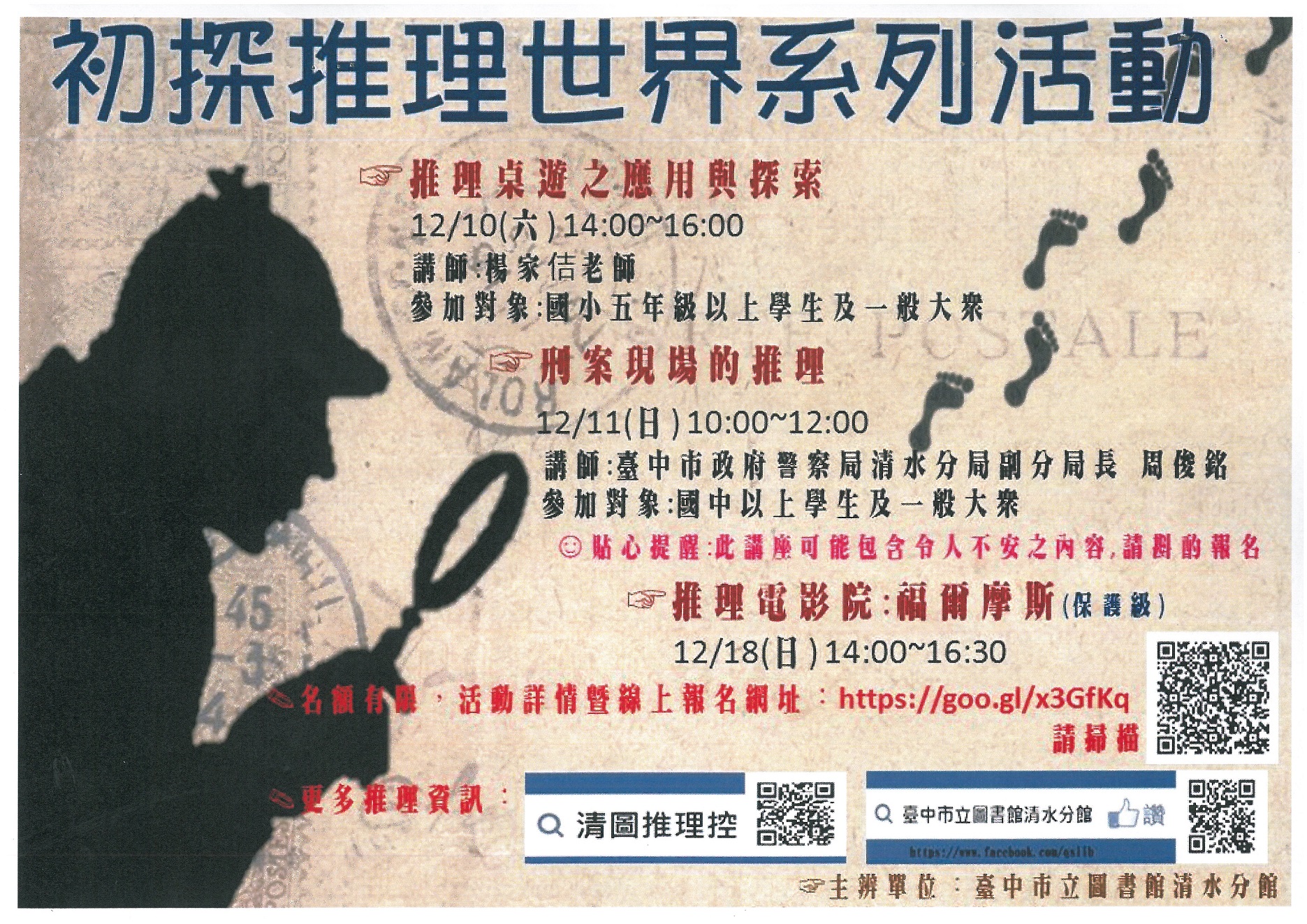 清水分館於105年12月10日(星期六)起舉辦「初探推理世界系列活動」,活動計3場次,名額有限,採線上報名,詳情請參閱活動網址(http://goo.gl/x3GfKq)。凡事先報名且參與者,活動結束後可獲贈由倪志榮先生捐贈之推理小說「化學偵探居禮先生」1本(每人所有場次限贈1本)。現場並發放偵探足跡卡進行偵探章集點活動及備有推理風卡貼供參與者索取。