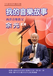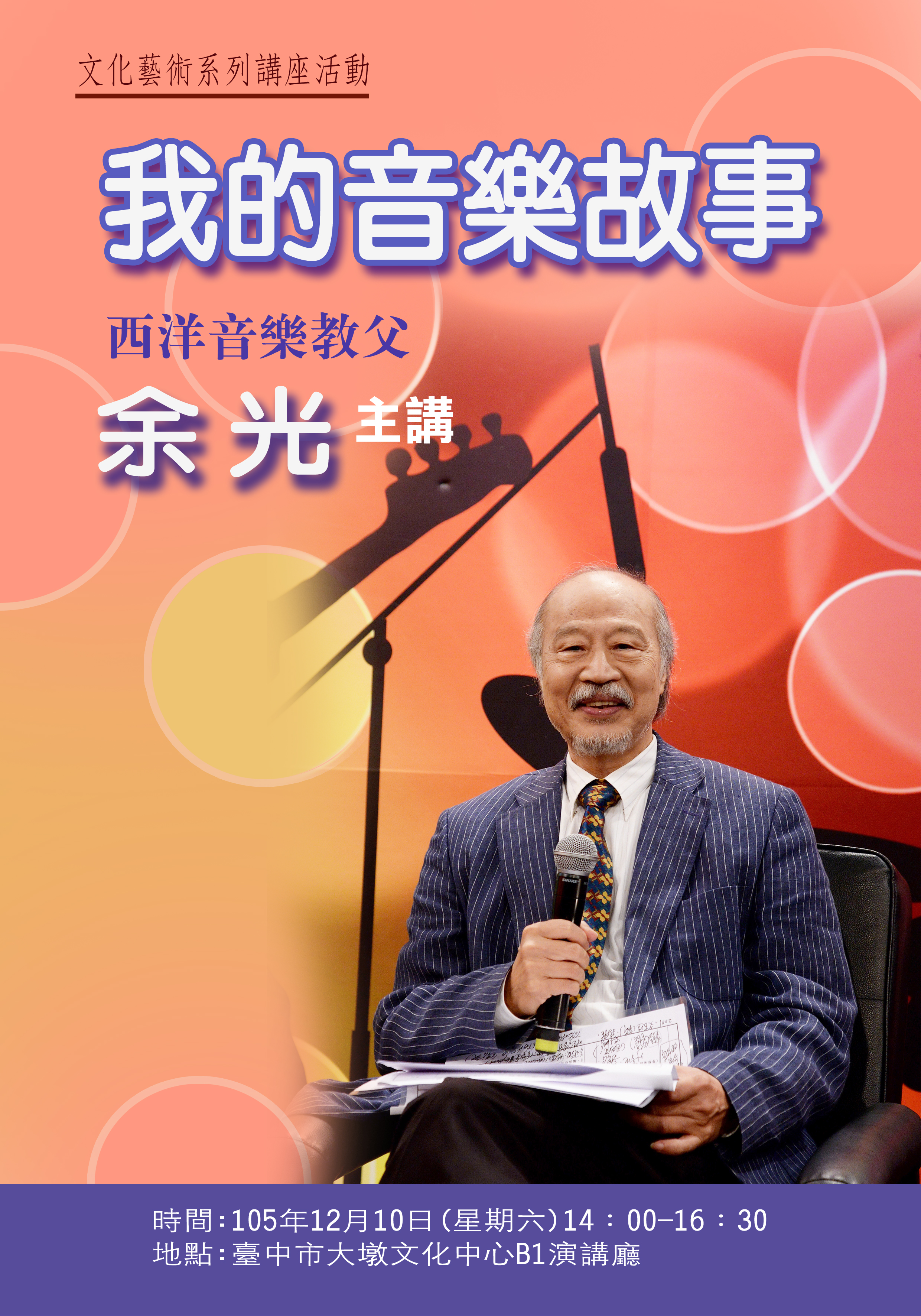 大墩文化中心邀請西洋音樂教父余光以「我的音樂故事」為主題進行講座活動,余光老師畢生大半歲月貢獻樂壇,曾任廣播及電視節目主持人、製作人,創辦「余光音樂雜誌」,策辦過上百場極為成功的演唱會,2013年更獲頒金鐘獎「特別貢獻獎」殊榮之肯定,本場講座,余光老師將引領我們進入西洋音樂殿堂,與聽眾樂迷們分享自己的音樂故事。