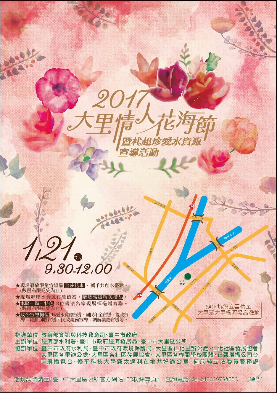 大里區公所辦理「2017大里情人花海節暨杙起珍愛水資源宣導活動」,敬請貴單位協助宣傳並鼓勵所屬踴躍參加!