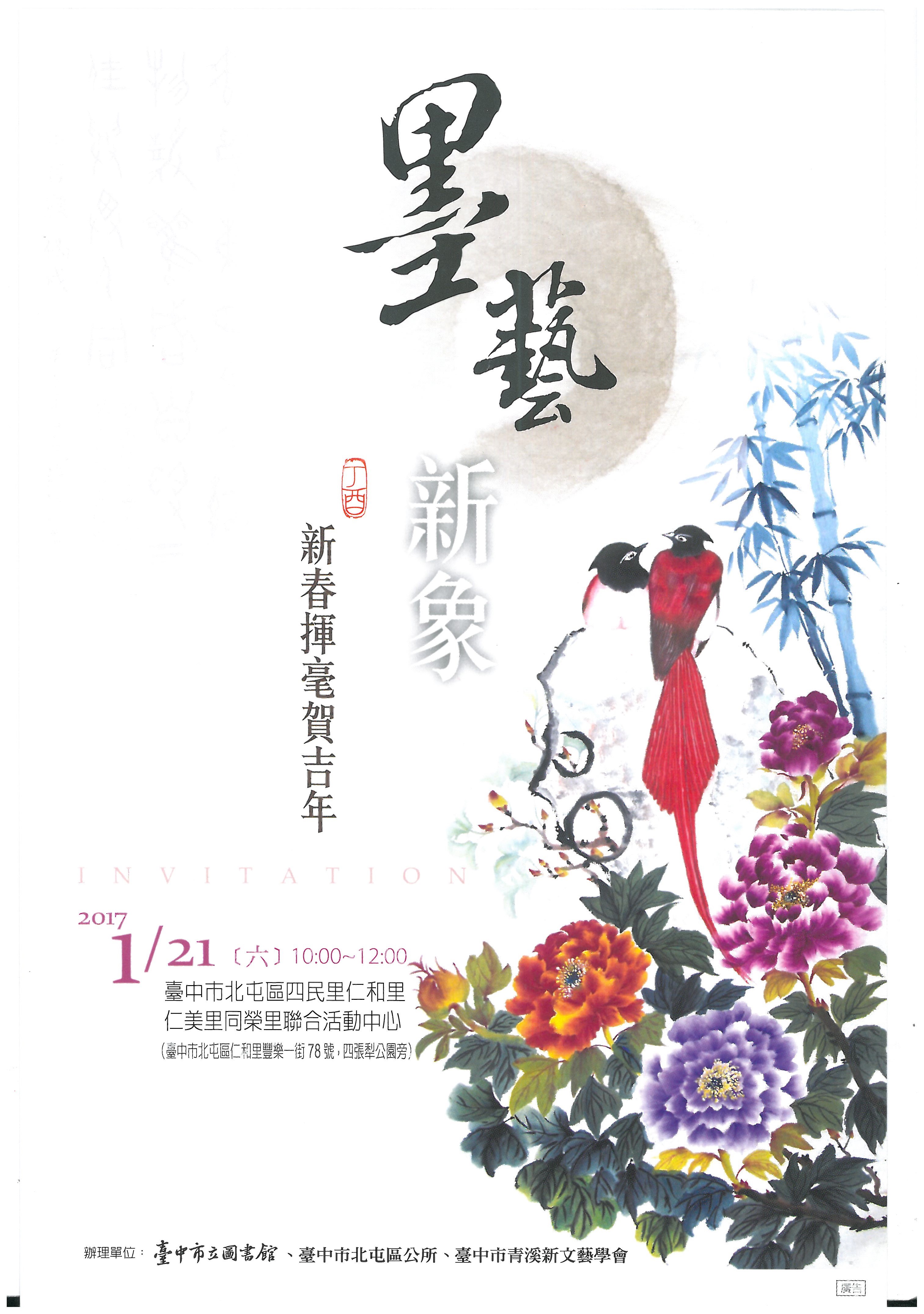 農曆新春將近,傳統年節文化以新桃換舊符、寓意吉祥的年畫或剪紙等,替佳節增添喜慶氣氛。臺中市立圖書館為推廣多元閱讀、落實生活美學,與臺中市北屯區公所、臺中市青溪新文藝學會共同辦理「新春揮毫賀吉年」活動,訂於106年1月21日(六)上午10時假臺中市北屯區四民里仁和里仁美里同榮里聯合活動中心,邀請書畫名家現場揮毫,即日起民眾至總館(原四張犁圖書館)借閱書籍滿20本即可領取年畫兌換券一張;活動當日除了兌換年畫,也將提供民眾免費排隊領取春聯,數量有限,送完為止;現場民眾更可一同動手體驗春聯創作,領略文字藝術的樂趣。