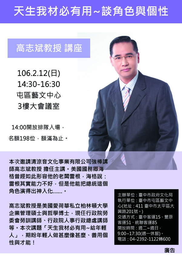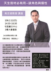 二、高志斌教授為美國愛荷華私立柏林頓大學企業管理碩士與哲學博士,現任行政院勞委會勞訓講師、行政院人事行政總處講師等。本次講題「天生我材必有用~談角色與個性」,期盼人人做甚麼像甚麼、善用個性與才能!