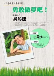 大墩文化中心邀請昆蟲老師吳沁婕以「勇敢做夢吧!」為題,進行講座活動。吳沁婕,臺大昆蟲系畢業,現在是大小朋友都愛的〈昆蟲老師〉、暢銷作家。她愛寫、愛畫、愛旅遊與愛攝影,陸續出版《More Than Wonderful 我的過動人生》、《昆蟲老師上課了!吳沁婕的超級生物課》、《勇敢做夢吧!不走都不知道自己有多厲害》…等書。因為她從小就是個非典型孩子,過動、喜歡帥氣打扮、養好多甲蟲…,在在都與很多人不一樣,而她相信人生從來不是公平的,每個人都獨一無二。分享她如何翻轉挫折轉換為自己成長的能量。講座時間:106年2月4日(星期六)14時至16時講座地點:大墩文化中心演講廳 聯絡人:林惠華 聯絡電話:04-23727311分機209