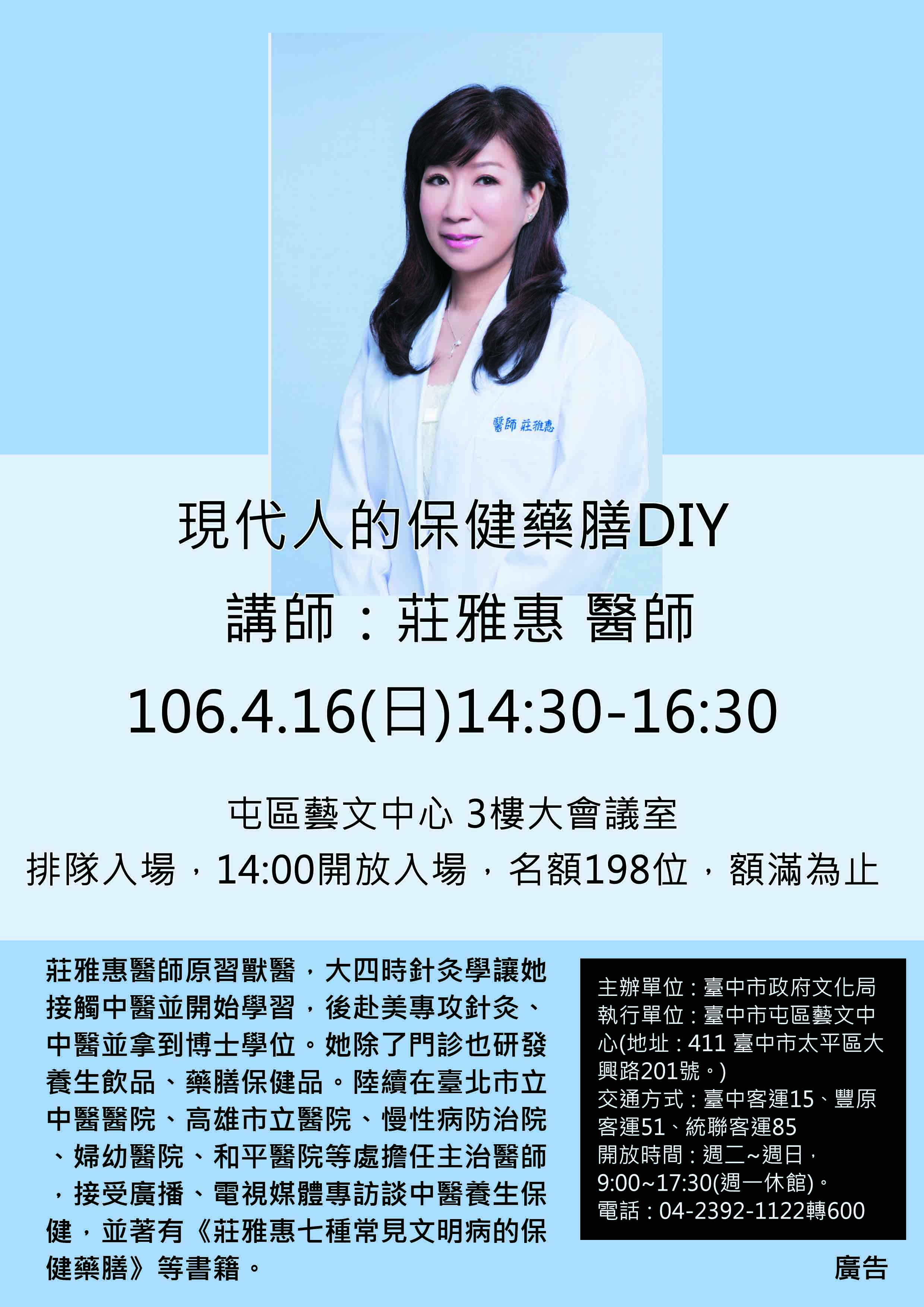 屯區藝文中心訂於106年4月16日(星期日)舉辦莊雅惠醫師講座「現代人的保健藥膳DIY」,莊醫師為莊雅惠中醫診所院長、漢補世家中醫顧問、中國電視台「生活新鮮報」、復興電台「生活百分百」、漢聲電台「幸福家族」養生主講人。著有《莊雅惠七種常見文明病的保健藥膳》等書籍。