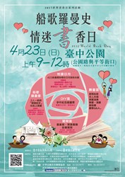 臺中市立圖書館為響應世界書香日,推廣城市閱讀,謹訂於4月23日假臺中公園舉行「船歌羅曼史 情迷書香日」活動。活動內容包含各圖書分館及閱讀相關團體設攤、舞台表演、邀請423對民眾在日月湖邊共讀的「悅讀日月」,以及於日月湖船上進行閱讀分享的「船歌讀書會」。