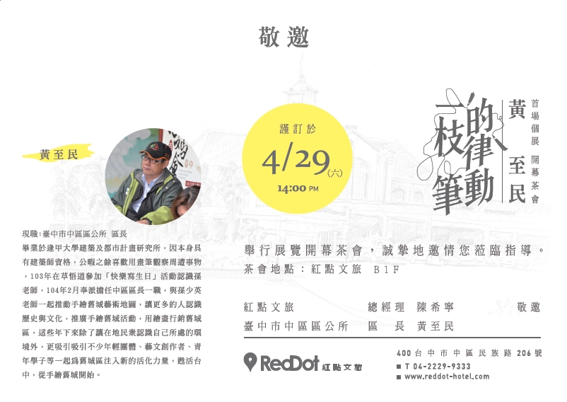 臺中市中區黃至民區長應轄內紅點文旅邀約,將自106年4月28日起至6月25日止,於該文旅1樓「美好藝廊」舉行首次個展,並訂於4月29日(六)下午2時舉行開幕茶會,誠摯地邀請大家蒞臨指導。