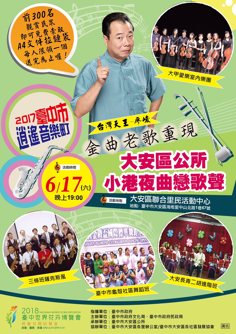 臺中市大安區公所謹訂於106年6月17日(星期六)晚上 7:00於臺中市大安區聯合里民活動中心廣場(臺中市大安區海墘里中山北路1巷67號)舉辦2017臺中市逍遙音樂町-小港夜曲戀歌聲音樂會暨市政宣導,敬請蒞臨指導。