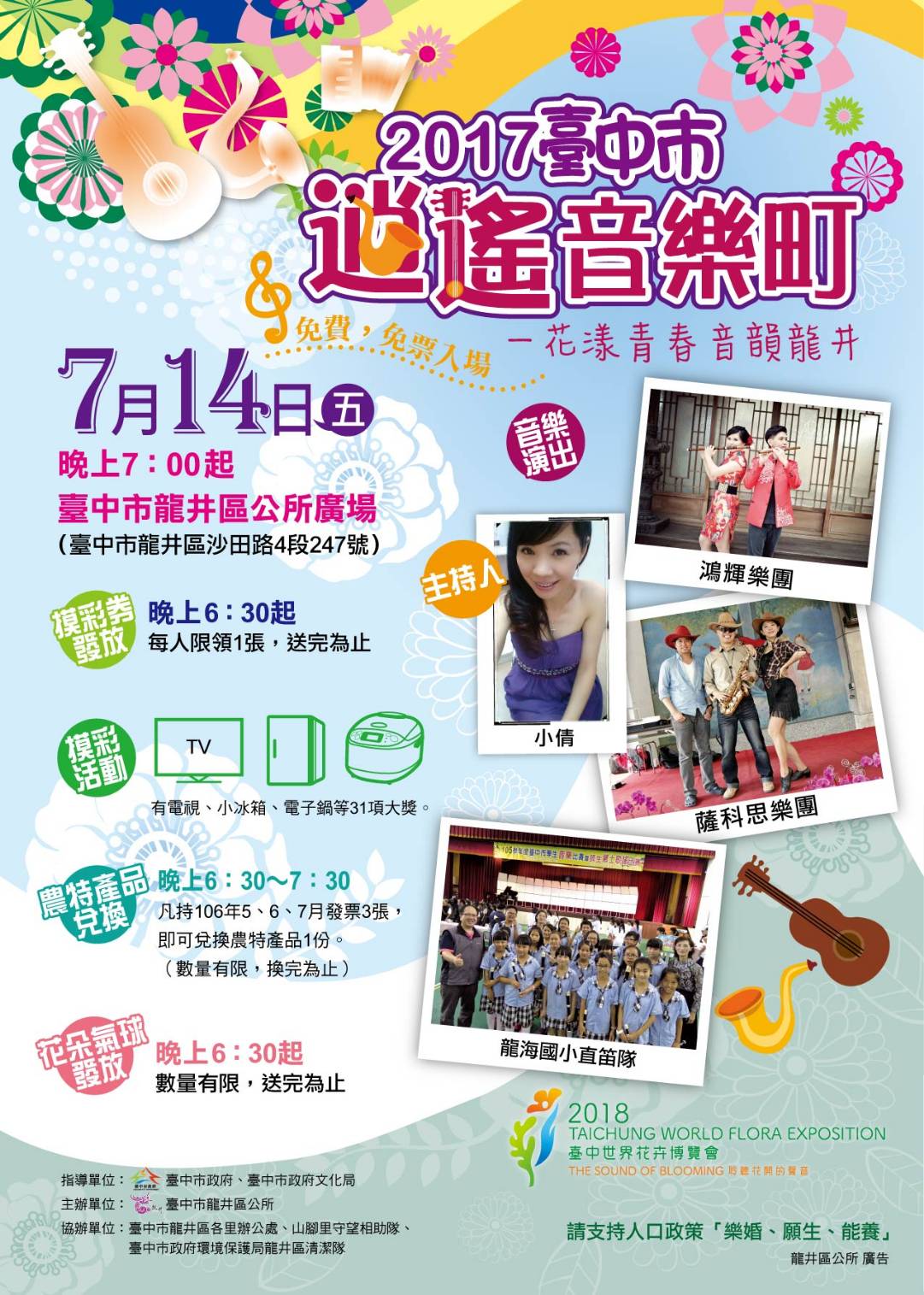 7月14日(五)晚上7時在龍井區公所前廣場舉辦「2017臺中市逍遙音樂町—花漾青春音韻龍井」音樂晚會,邀請薩科思樂團、龍海國小直笛隊、鴻輝樂團現場精采表演及電台DJ小倩主持,更有多項摸彩好禮及花朵造型氣球要送給大家,歡迎共襄盛舉!更多活動訊息請上龍井區公所網站(http://www.longjing.taichung.gov.tw/)最新消息查詢
