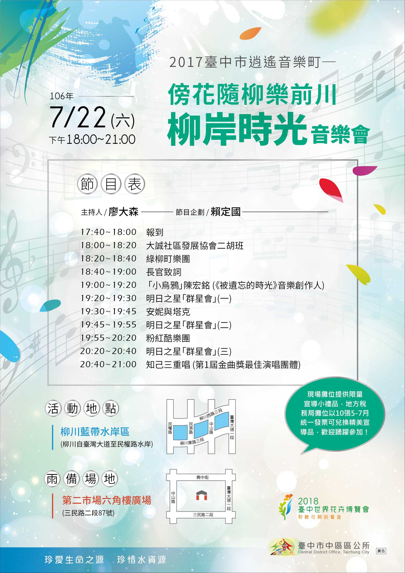 7月22日週六晚上6時至9時,中區柳川藍帶水岸,廖大森主持,實力派樂手「小烏鴉」陳宏銘、知己三重唱、安妮塔克、綠柳町樂團、明日之星「群星會」,將以完美和聲,帶您回味過去到現在不同年代的民歌戀曲,「2017臺中市逍遙音樂町─傍花隨柳樂前川─柳岸時光音樂會」柳岸最美的回憶,是與你在一起的時光─相約柳岸,不見不散!