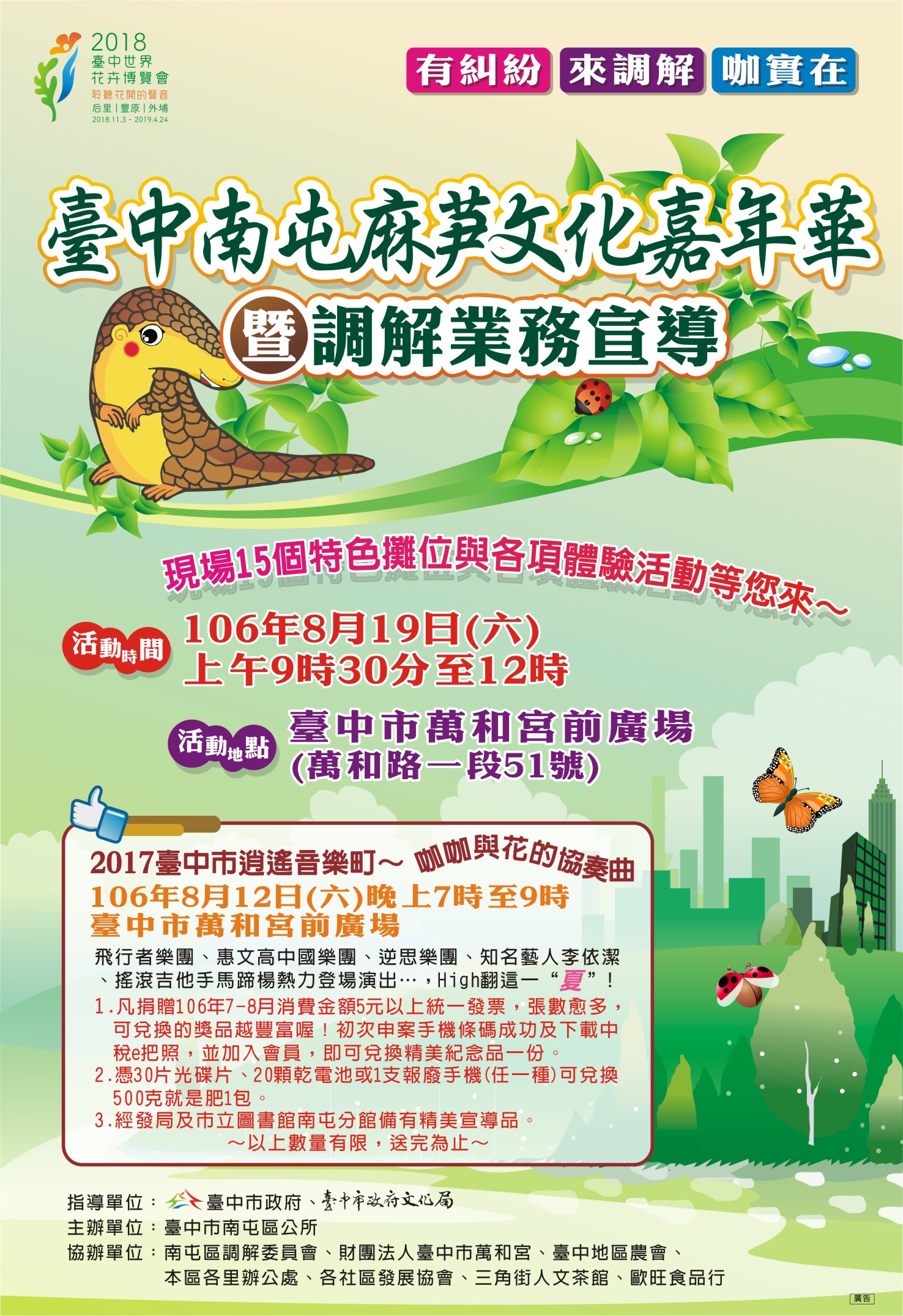一、「106年臺中南屯麻芛文化嘉年華暨調解業務宣導」活動訂於106年8月19日(星期六)上午9時30分至12時在本市南屯區臺中市萬和宮前廣場辦理,規劃精采舞臺表演、麻芛美食市集、南屯旅遊讚大富翁遊戲及DIY體驗等民俗節慶暨產業推廣活動,歡迎大家踴躍參與。二、檢附「106年臺中南屯麻芛文化嘉年華暨調解業務宣導」海報及活動流程電子檔一份。 聯絡人:江小姐 聯絡電話:(04)24752799#306